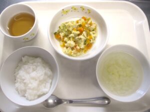 離乳食(中期)午前食:おかゆ、高野豆腐と冬瓜の煮物、スープ