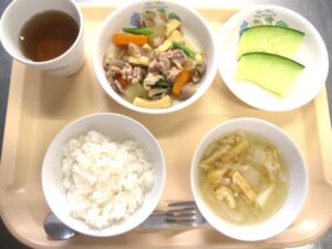 昼食:ご飯、豚肉と冬瓜の煮物、みそ汁(油揚げ、玉ねぎ、じゃがいも)、メロン、麦茶