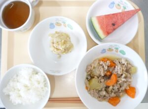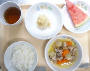 昼食:ごはん、豚肉と冬瓜の煮物、みそポテト、すいか、麦茶