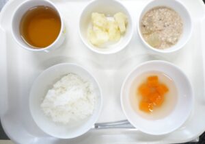 離乳食後期の昼食:おかゆまたは軟飯、冬瓜のそぼろ煮、ごまみそポテト、みそ汁、麦茶