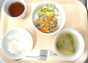 昼食:豚肉と切干大根の炒め煮、のりポテト、みそ汁(わかめ、たまねぎ、しめじ)、麦茶