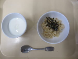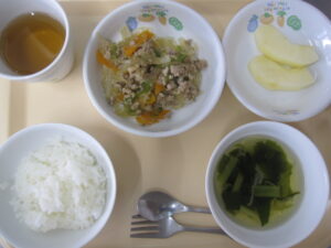 昼食:ご飯、豚肉と春雨の味噌炒め、スープ、