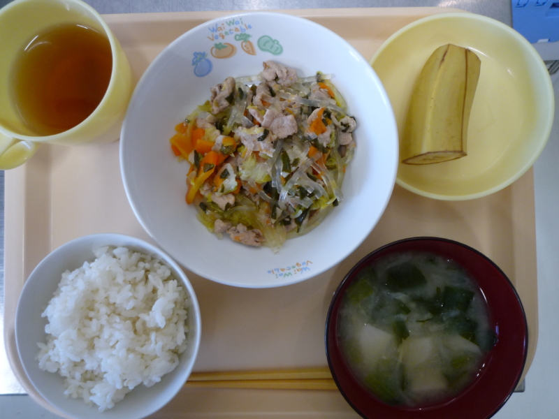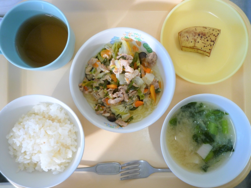 昼食:ご飯、豚肉と白菜のうま煮、みそ汁(切干大根、小松菜、里芋)、バナナ、麦茶