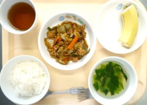 昼食:ごはん、豚肉と白菜の味噌炒め、スープ、バナナ、麦茶