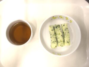 離乳食(後期)午後おやつ:小松菜蒸しパン、麦茶