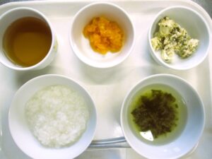 離乳食(中期)午前食:おかゆ、肉豆腐、スティック人参、すまし汁