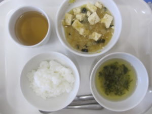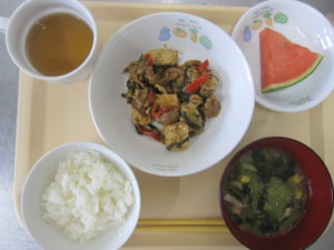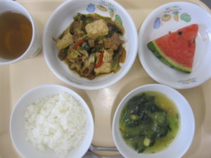 昼食:ご飯、豚肉と豆腐の味噌チャンプルー、コーンスープ、すいか、麦茶