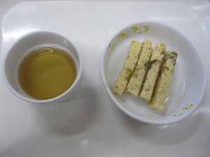 離乳食(後期)午後おやつ:麦茶、キャロットバナナパンケーキ