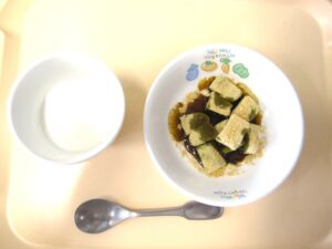 離乳食(後期)午後おやつ:和風豆乳もち、麦茶