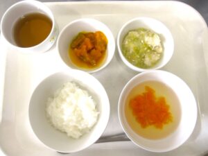 離乳食(中期)午前食:おかゆ、肉団子とキャベツ煮、かぼちゃ煮、すまし汁