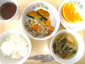 昼食:ご飯、豚肉と野菜の味噌炒め、焼きかぼちゃ、すまし汁(しらたき、三つ葉、かまぼこ、まいたけ)、オレンジ(乳児のみ)、麦茶
