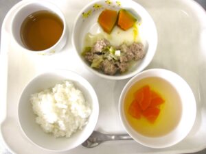 離乳食(後期)昼食:おかゆ又は軟飯、肉団子とキャベツ煮、かぼちゃ煮、すまし汁