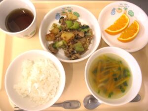 昼食:ご飯、豚肉と青菜の和風炒め(豚肉、チンゲン菜、玉ねぎ、じゃがいも、削り節)、じゃこスープ(ちりめんじゃこ、人参、万能ねぎ、しょうが)、オレンジ、麦茶