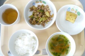 昼食:ご飯、豚肉と青菜の和風炒め、じゃこスープ、バナナ、麦茶