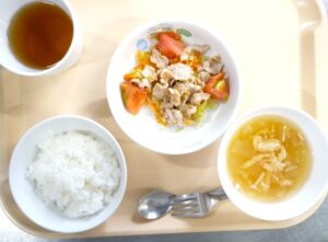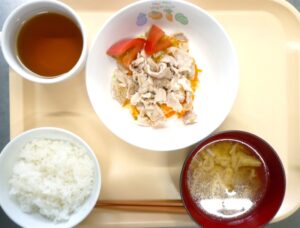 昼食:ごはん、豚肉のごまだれ、トマト、すまし汁、麦茶