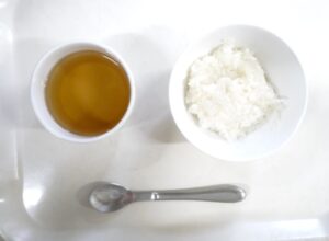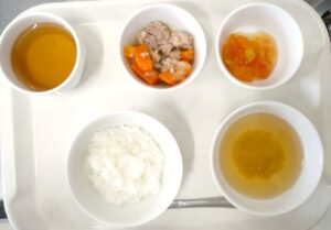離乳食後期の昼食:ごはん、豚つくねと野菜のごま煮、トマト、すまし汁、麦茶