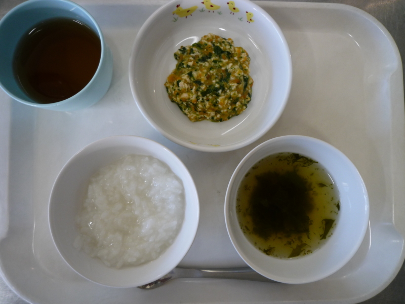 離乳食(中期)午前食:おかゆ、ほうれん草のそぼろ煮、スープ(水菜)