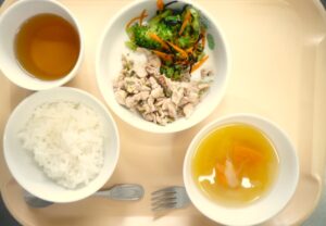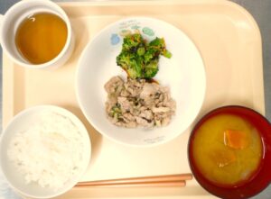 昼食:ごはん、豚肉のねぎ塩炒め、ブロッコリーの磯和え、みそ汁(かぼちゃ、玉ねぎ)、麦茶