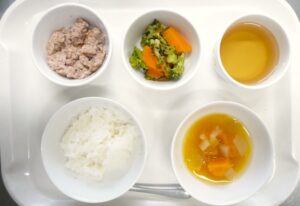離乳食(後期)昼食:おかゆまたは軟飯、豚つくねのねぎ塩炒め、ブロッコリーの磯和え、みそ汁