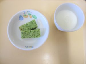 午後おやつ:牛乳、ほうれん草パンケーキ