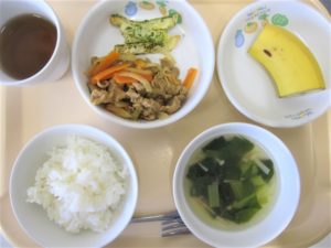 昼食:ごはん、豚肉のカレーソテー、ベイクドポテト、スープ(小松菜、ベーコン、えのき)、バナナ、麦茶