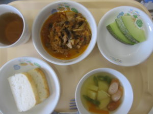 昼食:米粉パン、豚肉のトマト煮、ポテトスープ、メロン、麦茶