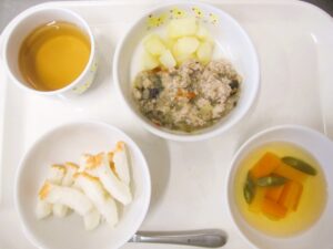 離乳食(後期)昼食:米粉パン、肉団子と夏野菜煮、じゃが芋煮、スープ
