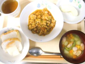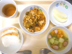 昼食:米粉パン、豚肉のトマト煮、ポテトスープ(じゃがいも、人参、いんげん、ウィンナー)、りんご、麦茶