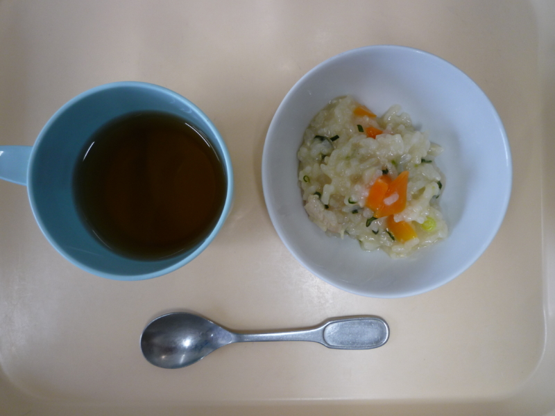 離乳食(後期)午後おやつ:麦茶、鶏がゆ