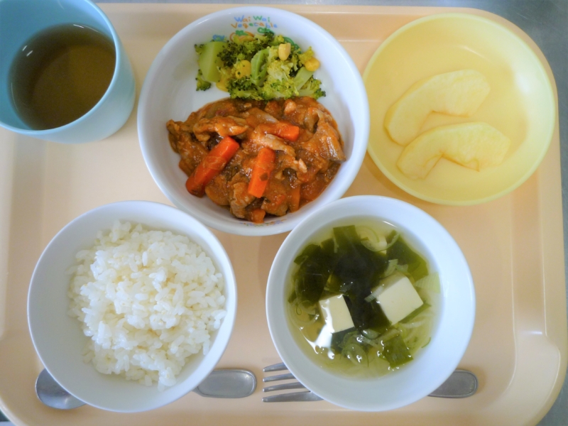 昼食:ご飯、豚肉のトマト煮、ブロッコリーのソテー、わかめスープ(わかめ、豆腐、長ねぎ)、りんご(乳児のみ)、麦茶
