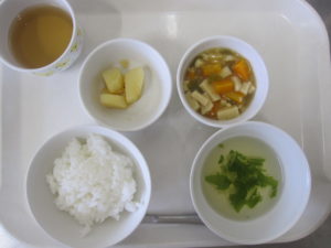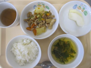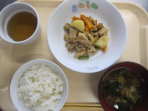 昼食:ごはん、豚肉の五目味噌煮、すまし汁(水菜、かまぼこ、えのき)、りんご、麦茶