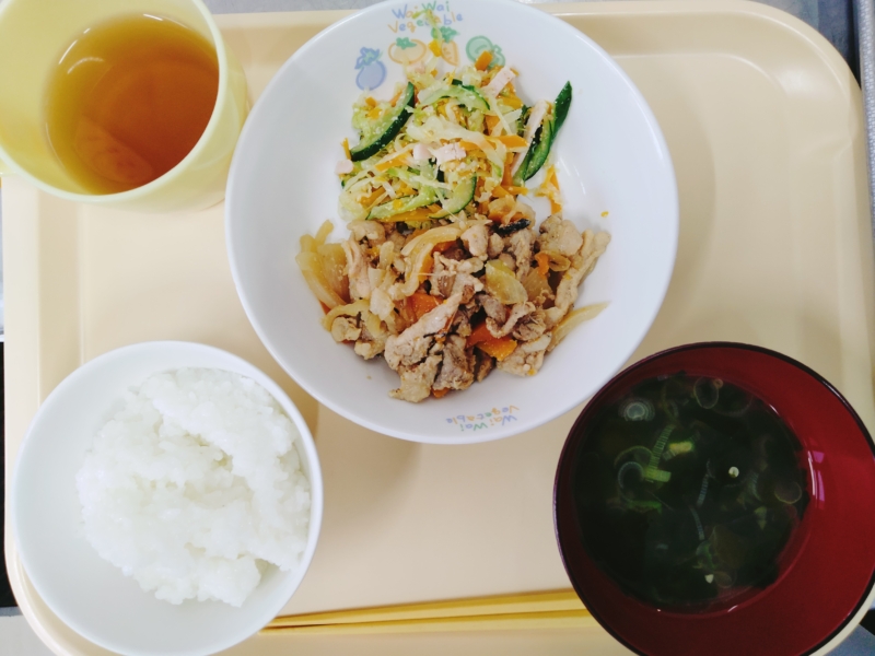 昼食:ご飯(アルファ米)、豚肉の生姜焼き、ごまサラダ、わかめスープ(わかめ、おくら、長ねぎ)、りんご(乳児のみ)、麦茶…乳児308㎉ 幼児364㎉