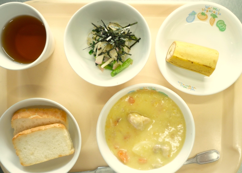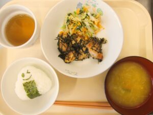 昼食:にこにこおにぎり、のり揚げチキン、ほうれん草のごまサラダ、コーンスープ(コーン、かぼちゃ、ベーコン、玉ねぎ)、りんご(乳児のみ)、麦茶