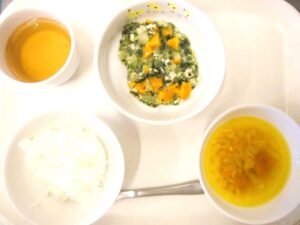 離乳食(後期)昼食:軟飯、キャベツのそぼろ煮、スープ(かぼちゃ、玉ねぎ)