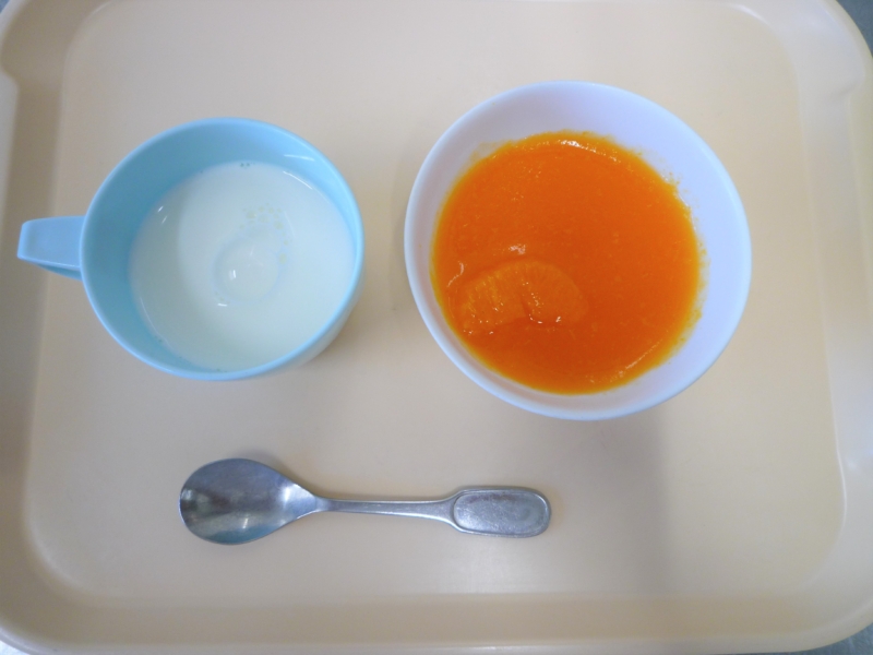 昼食:ご飯、酢豚(豚肉、玉ねぎ、人参、ピーマン、じゃがいも、パイン缶)、にらとコーンのスープ(水菜、にら、コーン)、りんご、麦茶