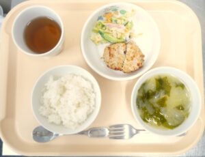昼食:ごはん、青じそつくね焼き、キャベツサラダ、みそ汁(玉ねぎ、わかめ、じゃがいも)、麦茶