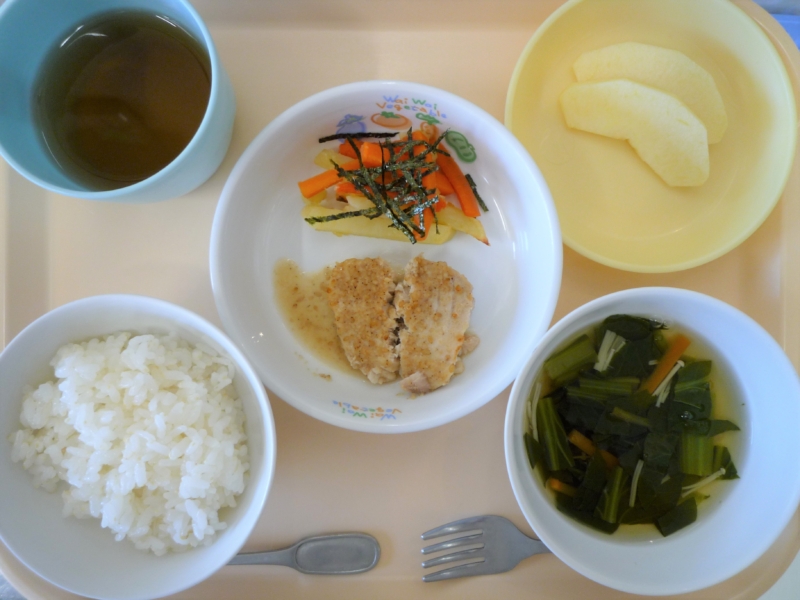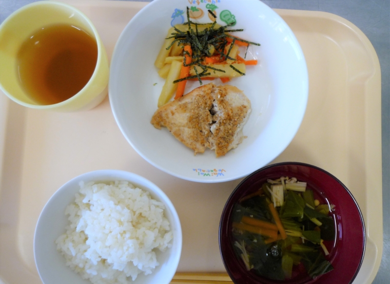 昼食:ご飯、魚のごま味噌だれ、じゃがいもきんぴら、すまし汁、りんご(乳児のみ)、麦茶