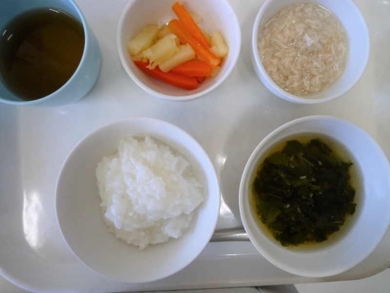 離乳食(後期)昼食:おかゆ、魚の味噌煮、じゃがいも煮、すまし汁