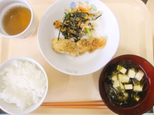 昼食:ご飯、魚のごま味噌だれ、ツナのり和え、すまし汁(わかめ、豆腐、長ねぎ)、バナナ(乳児のみ)、麦茶