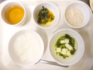 離乳食(中期)午前食:おかゆ、すずきの煮付け、おひたし、すまし汁