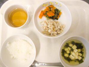 離乳食(後期)昼食:軟飯、魚のごま味噌だれ、おひたし、すまし汁