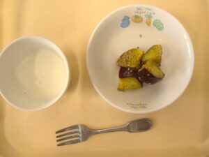 午後おやつ:大学芋、牛乳