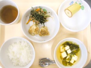 昼食:ご飯、魚のごま味噌だれ、ツナのり和え、すまし汁(わかめ、豆腐、長ねぎ)、バナナ(乳児のみ)、麦茶