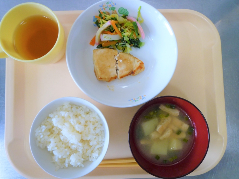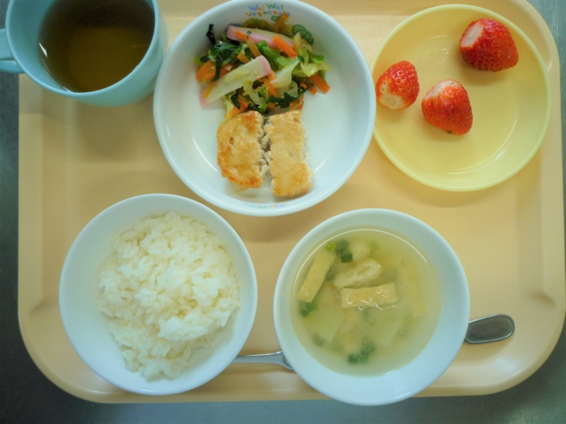 昼食:ご飯、魚の照り焼き、千草和え、みそ汁(油揚げ、万能ねぎ、じゃがいも)、いちご(乳児のみ)、麦茶
