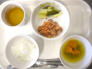 昼食:ごはん、鮭のあかね焼き、アスパラのソテー、みそ汁(かぼちゃ、油揚げ、万能ねぎ)、オレンジ(乳児のみ)、麦茶