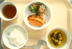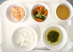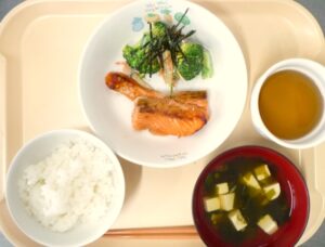 昼食:ごはん、鮭のあかね焼き、ブロッコリーの磯和え、すまし汁
