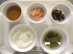 離乳食(中期)午前食:おかゆ、鮭のうま煮、ひじき煮、スープ