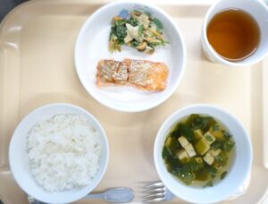 昼食:ごはん、鮭の塩こうじ焼き、ほうれん草のごま和え、すまし汁(わかめ、三つ葉、豆腐)、麦茶