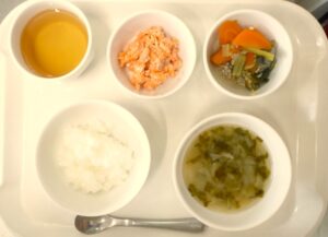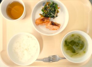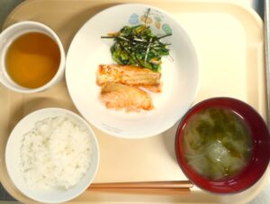 昼食:ごはん、鮭の塩こうじ焼き、おくらのおひたし、みそ汁、麦茶