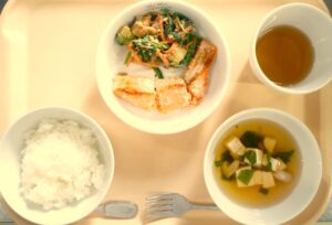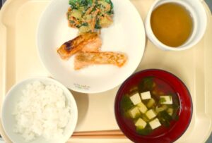 昼食:ごはん、鮭の塩こうじ焼き、ほうれん草のごま和え、すまし汁